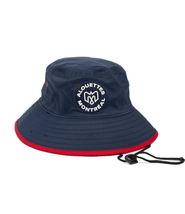 Navy blue adjustable bucket hat from New Era with red details around the lid and the Alouettes logo in white on the front